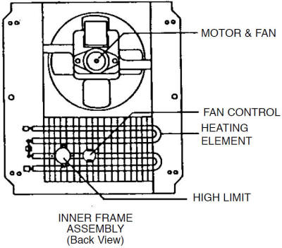 HEATER ASSEMBLY: The heater assembly, which fits in the back box, shall consist of a fan panel upon which is mounted all of the operational parts of the heater.